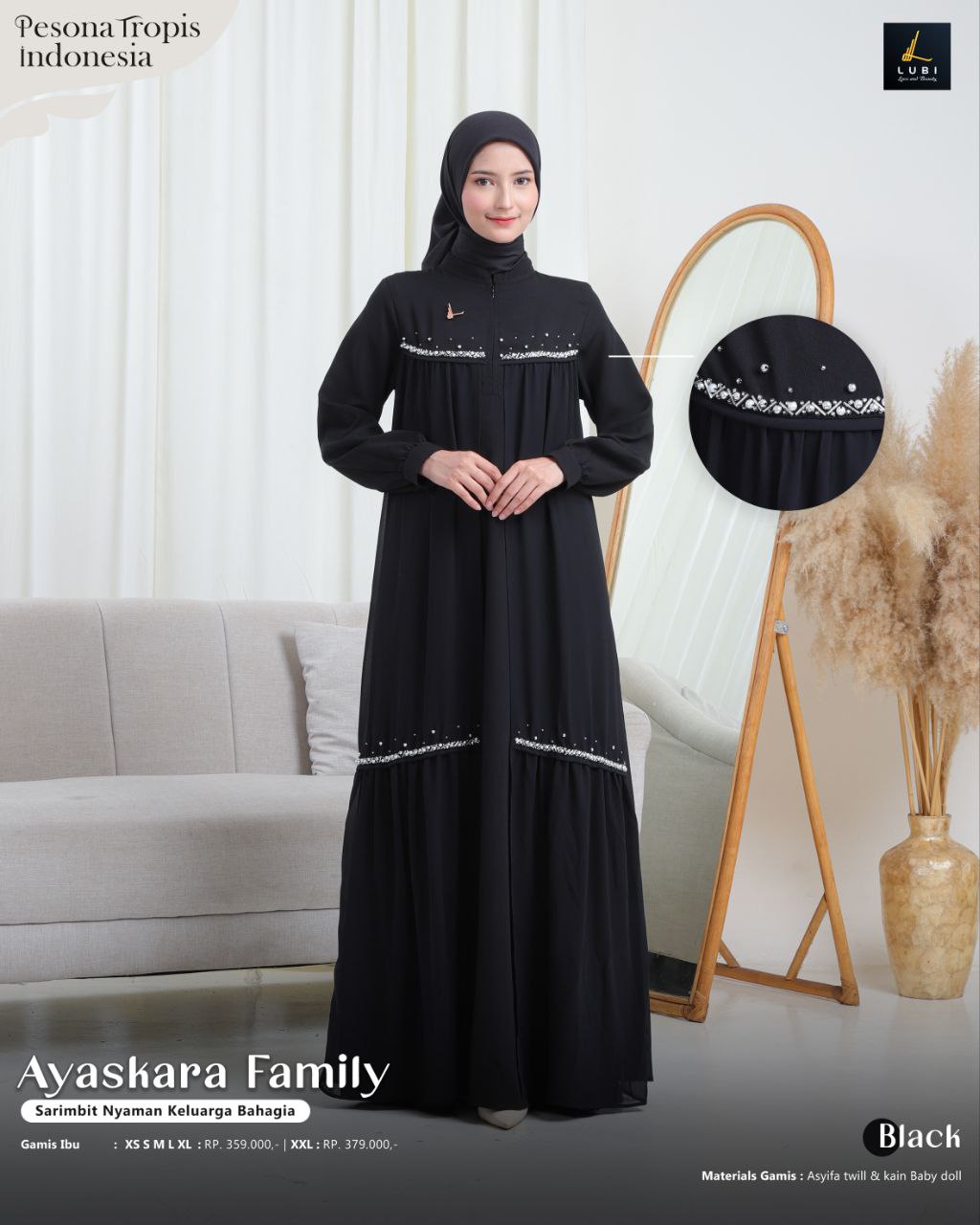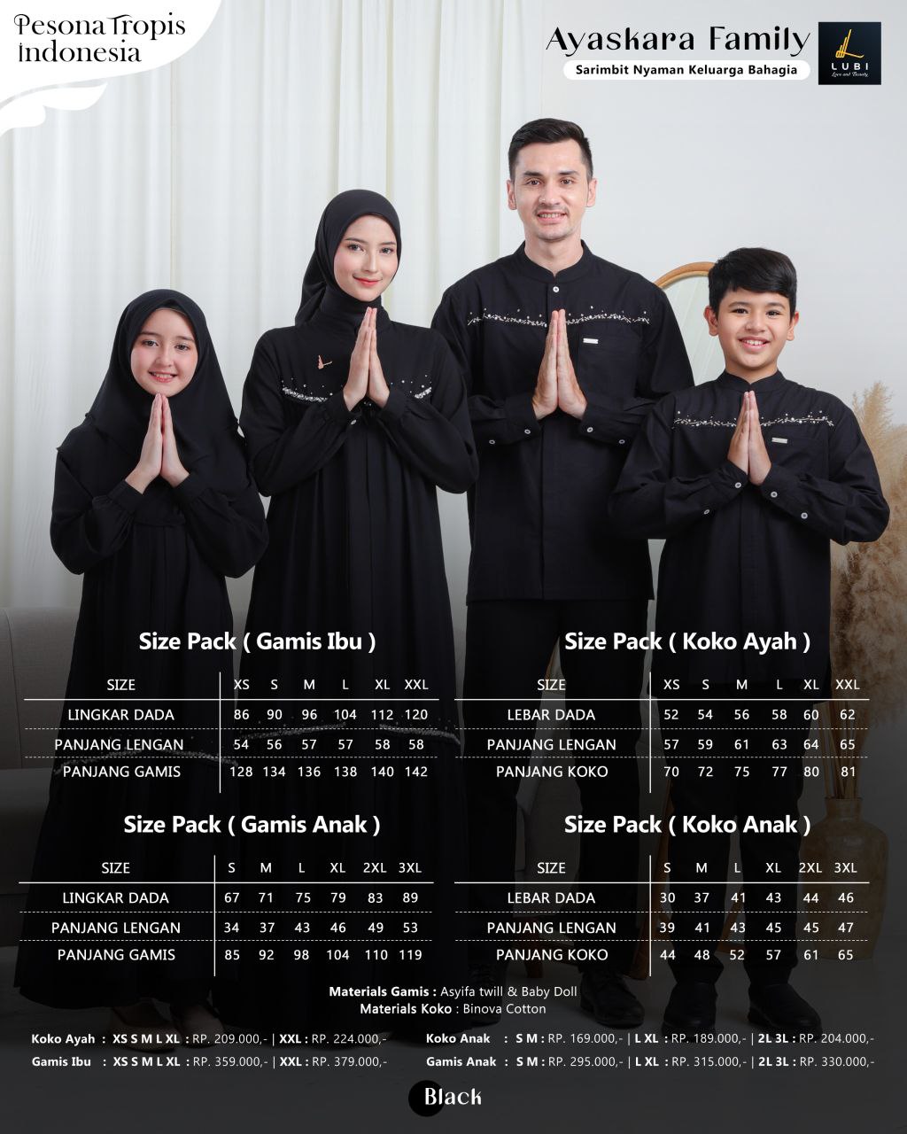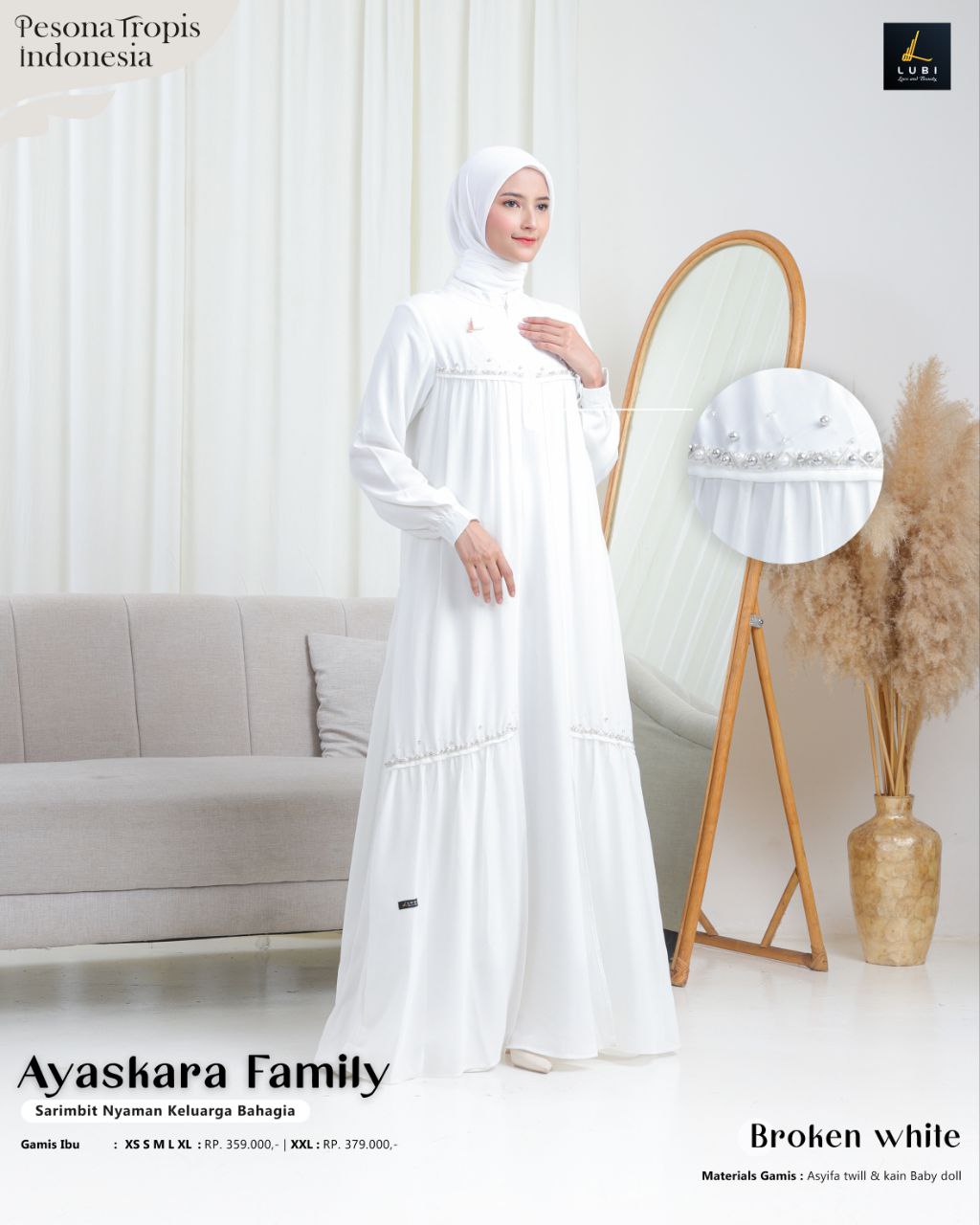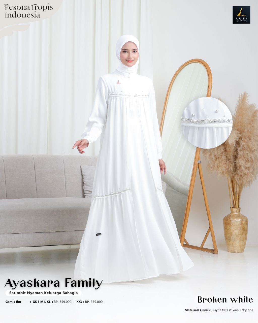 Gamis terbuat dari kain utama _Asyifa twill_ adalah jenis kain yang memiliki karakteristik tekstur yang halus, flowly, tidak menerawang dan menyerap keringat. dipadukan dengan kain _Baby doll premium_ jenis kain yang memiliki karakteristik ringan, elastis, lembut & flowly. Sehingga perpaduan keduanya cantik, mewah & nyaman saat dikenakan.