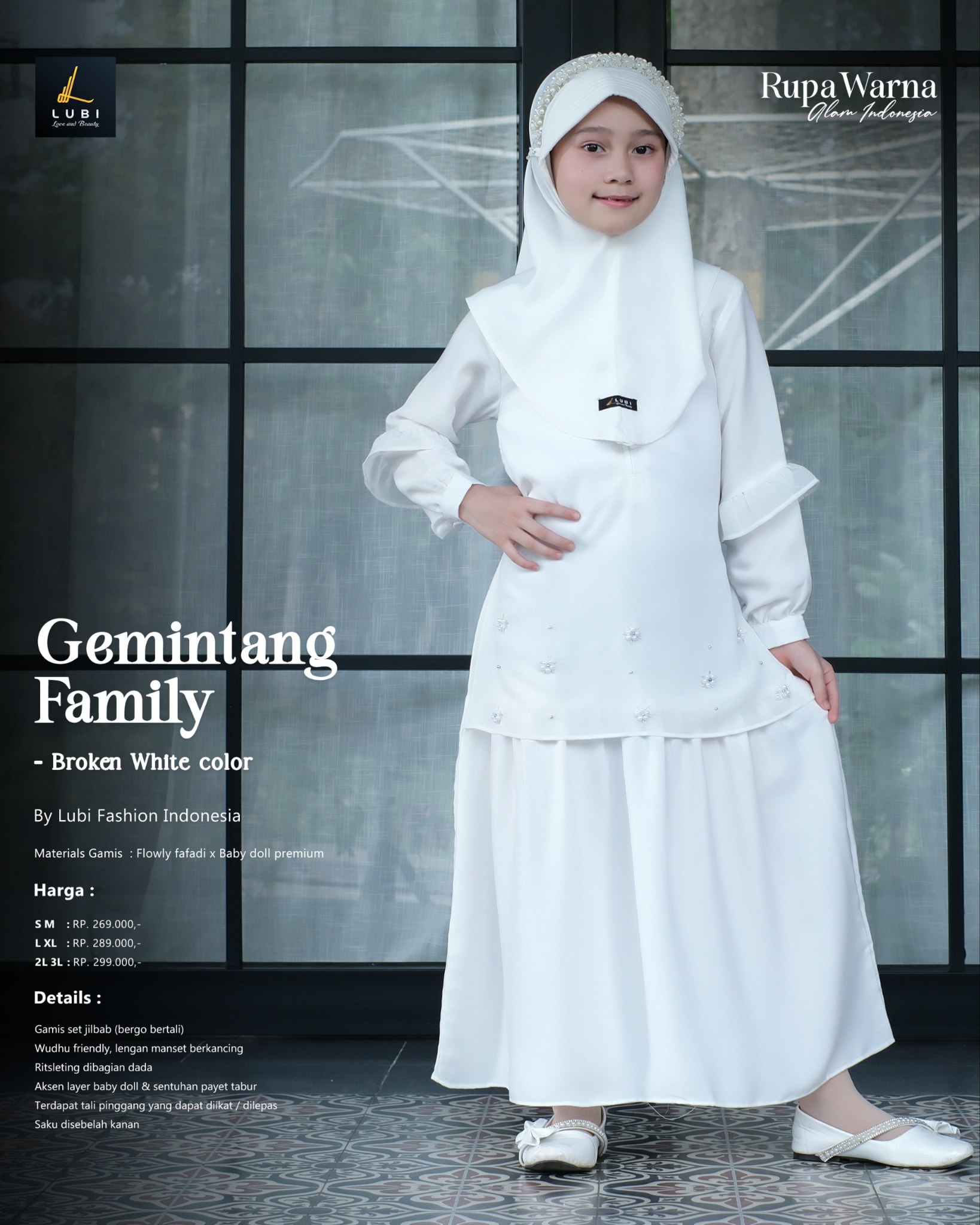 Dikombinasikan dengan kain Baby doll adalah jenis kain yang memiliki karakteristik teksturnya yang ringan dan transparan sehingga flowly & mampu menciptakan look nya yang elegan & mewah.