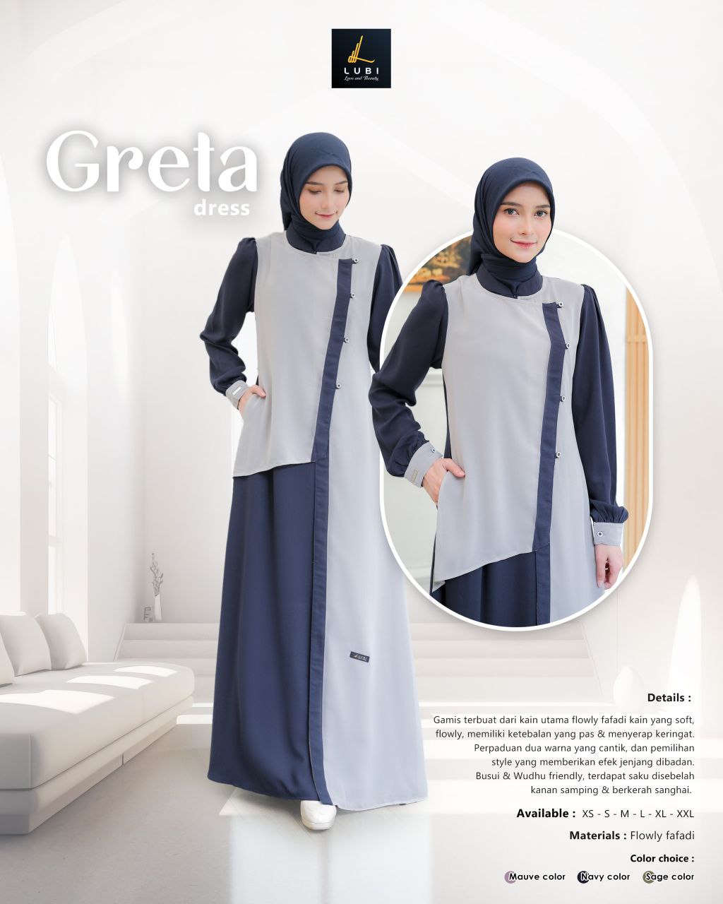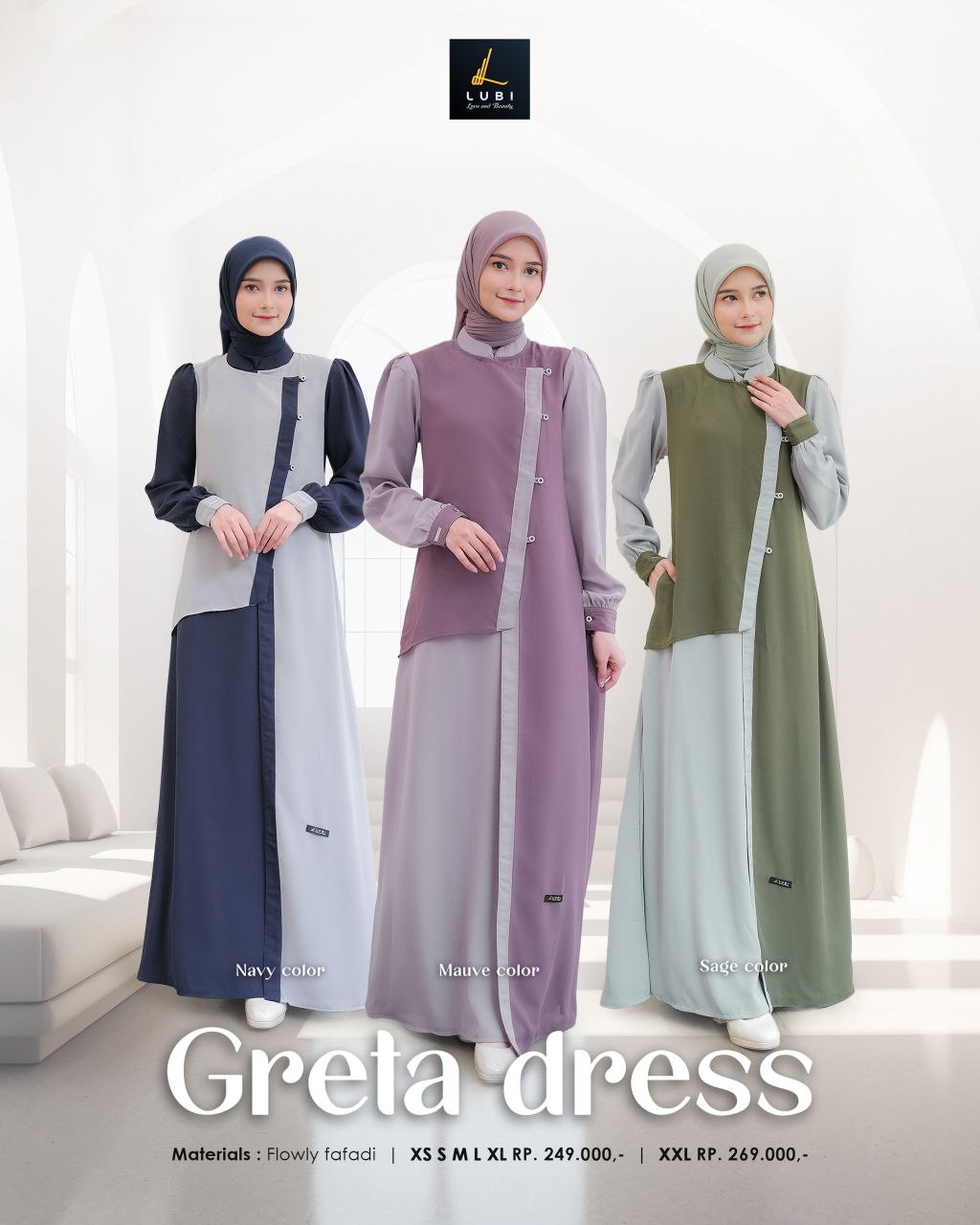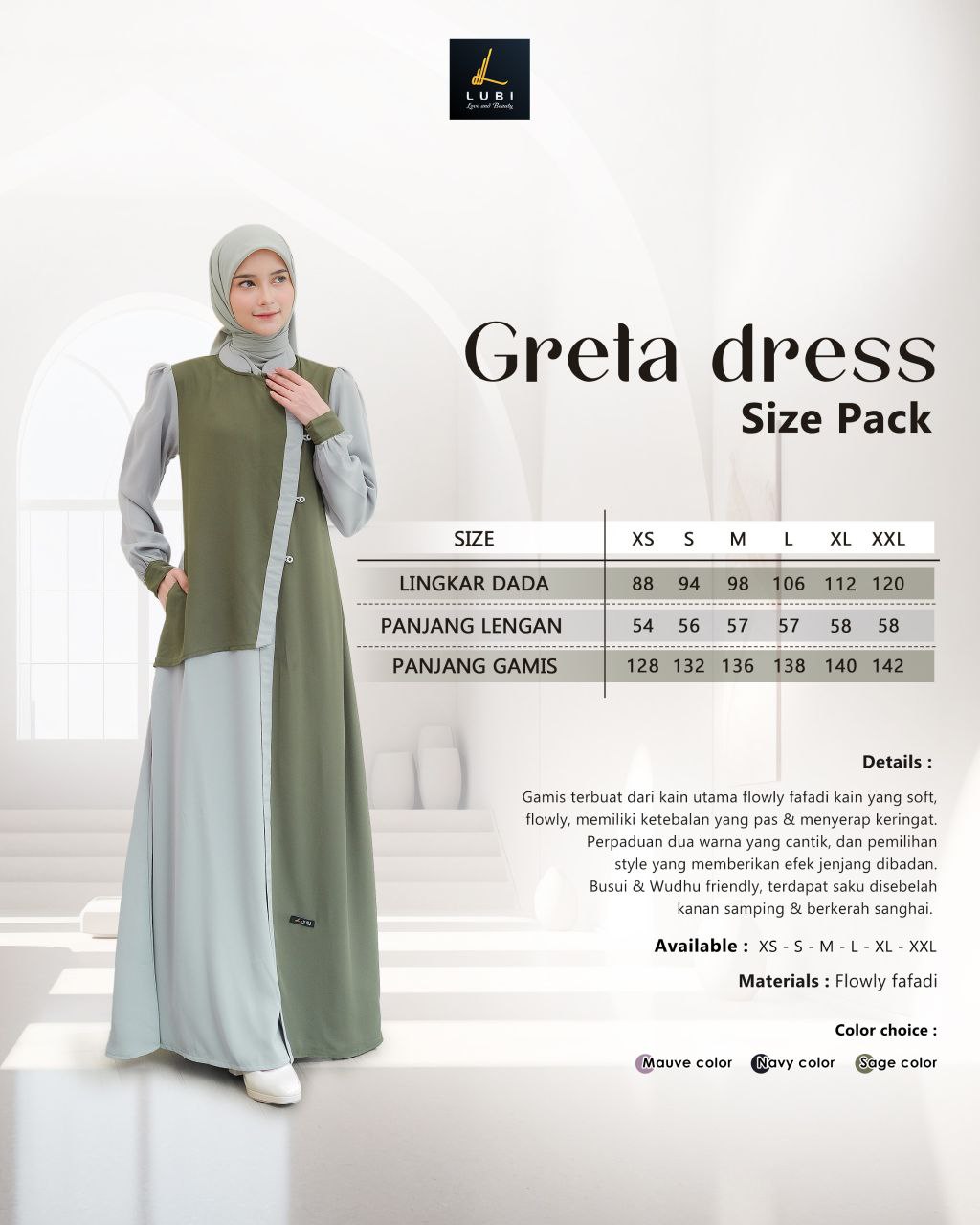 Terbuat dari kain Flowly fafadi jenis kain yang memiliki karakteristik tekstur yang halus, flowly, tidak menerawang dan menyerap keringat. Dikombinasikan dengan kain Baby doll adalah jenis kain bertektur ringan, halus, lembut & flowly.