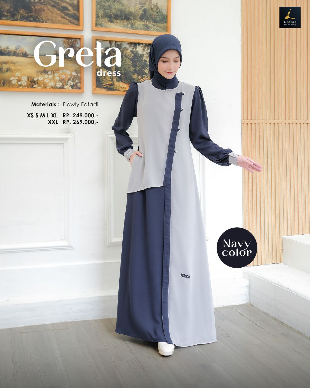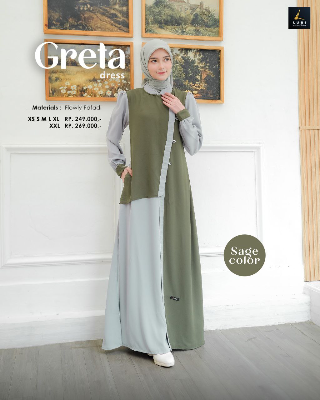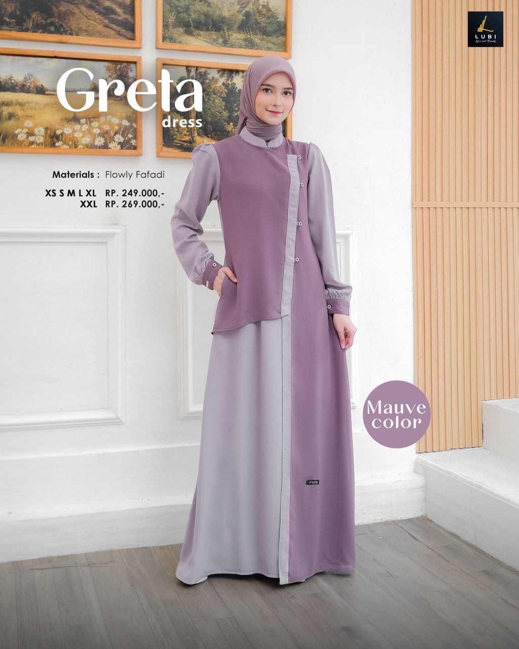 Terbuat dari kain Flowly fafadi jenis kain yang memiliki karakteristik tekstur yang halus, flowly, tidak menerawang dan menyerap keringat. Dikombinasikan dengan kain Baby doll adalah jenis kain bertektur ringan, halus, lembut & flowly.