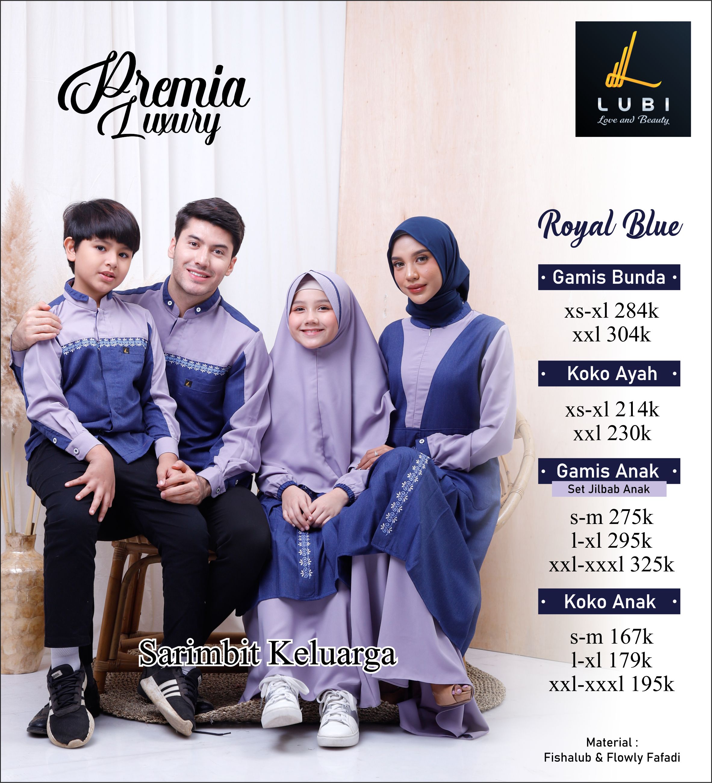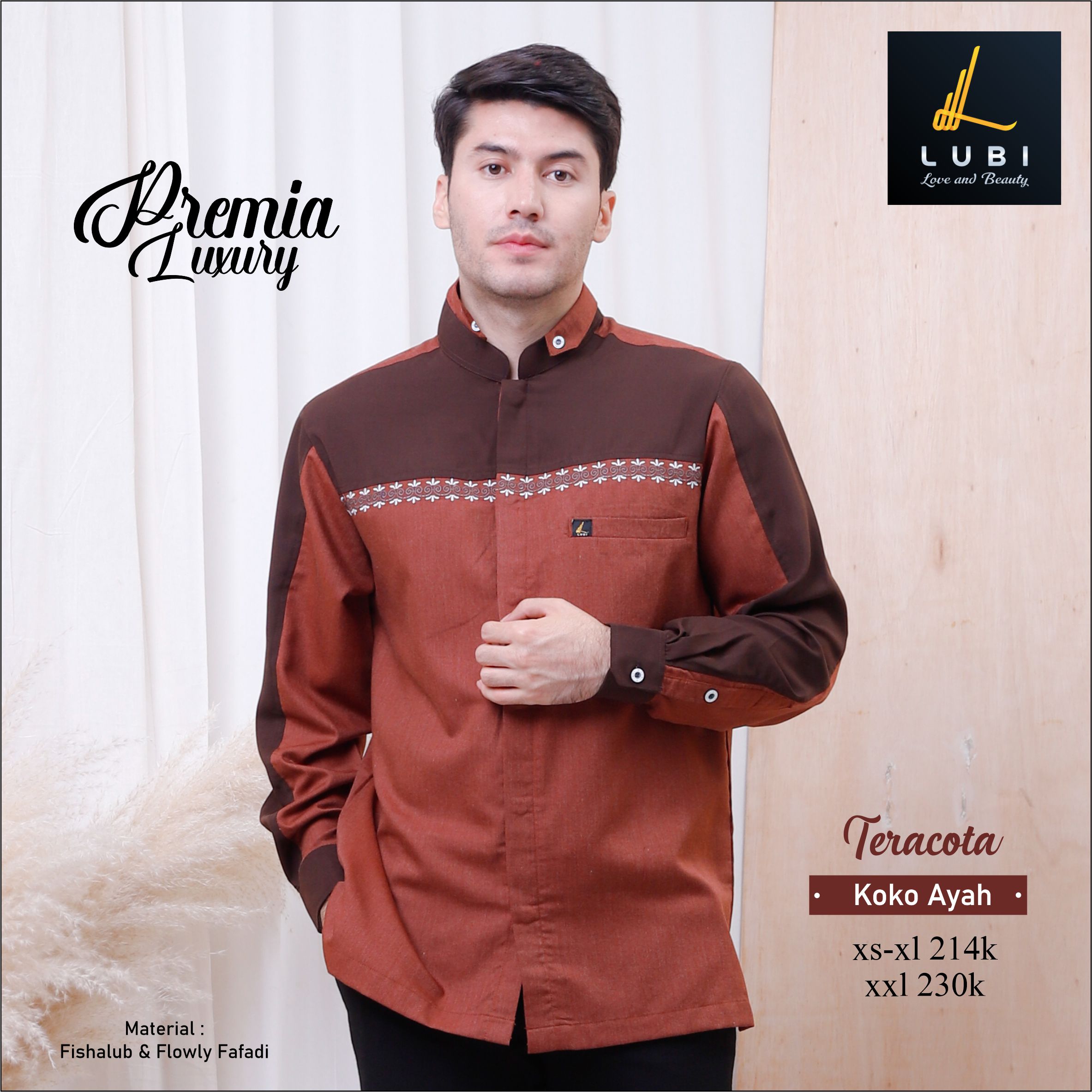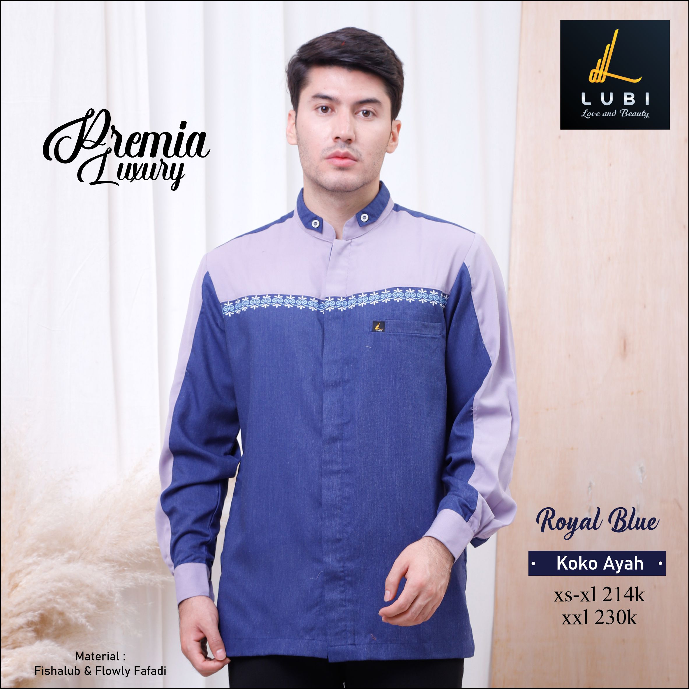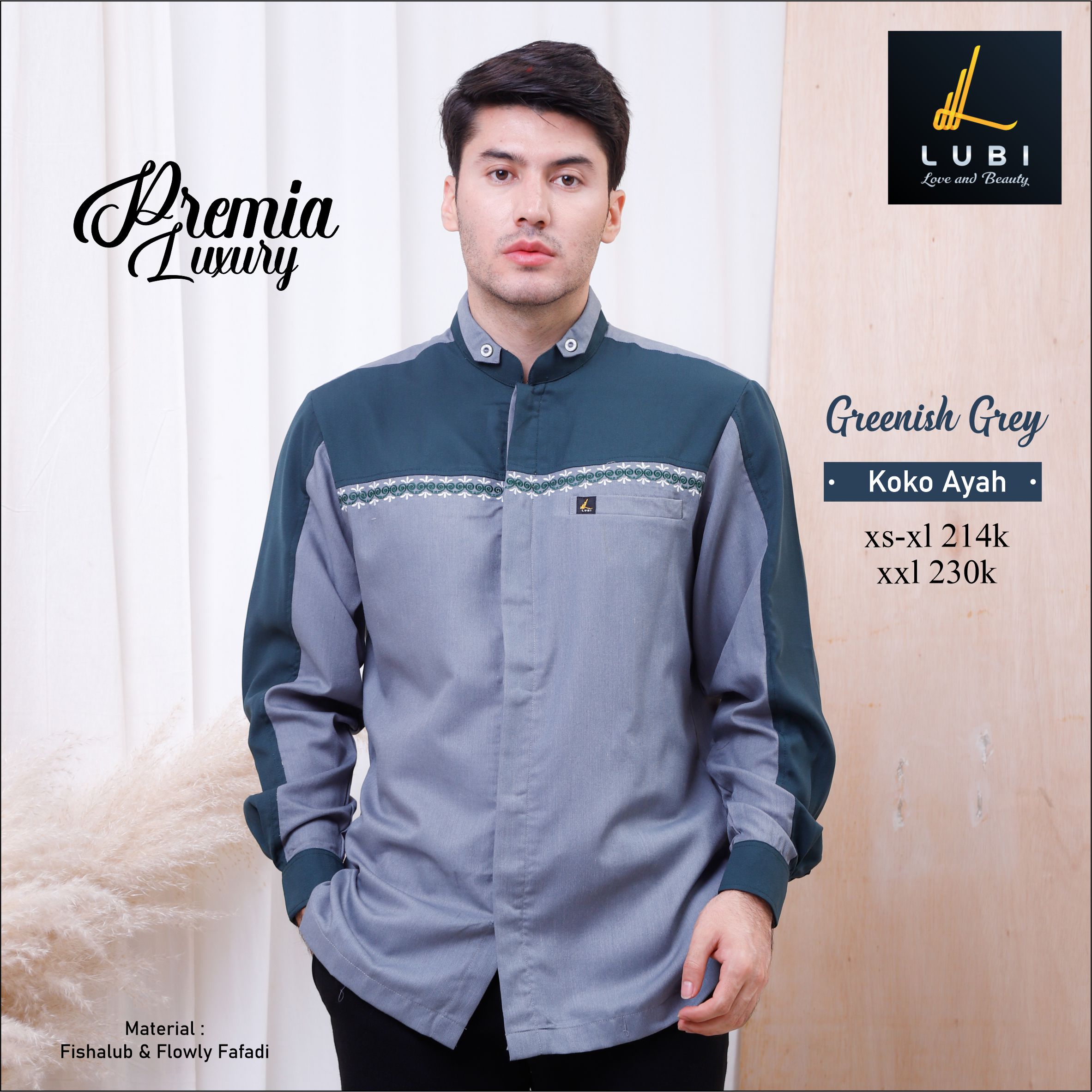 Bahan Flowly Fafadi, memiliki karakteristik bahan yg lembut, adem, menyerap keringat, jatuh, looknya mewah, anti kusut, dan tidak terawang. Dipadukan dengan bahan Fishalub, memiliki karakteristik jatuh, lembut adem dan tidak terawang. High quality material